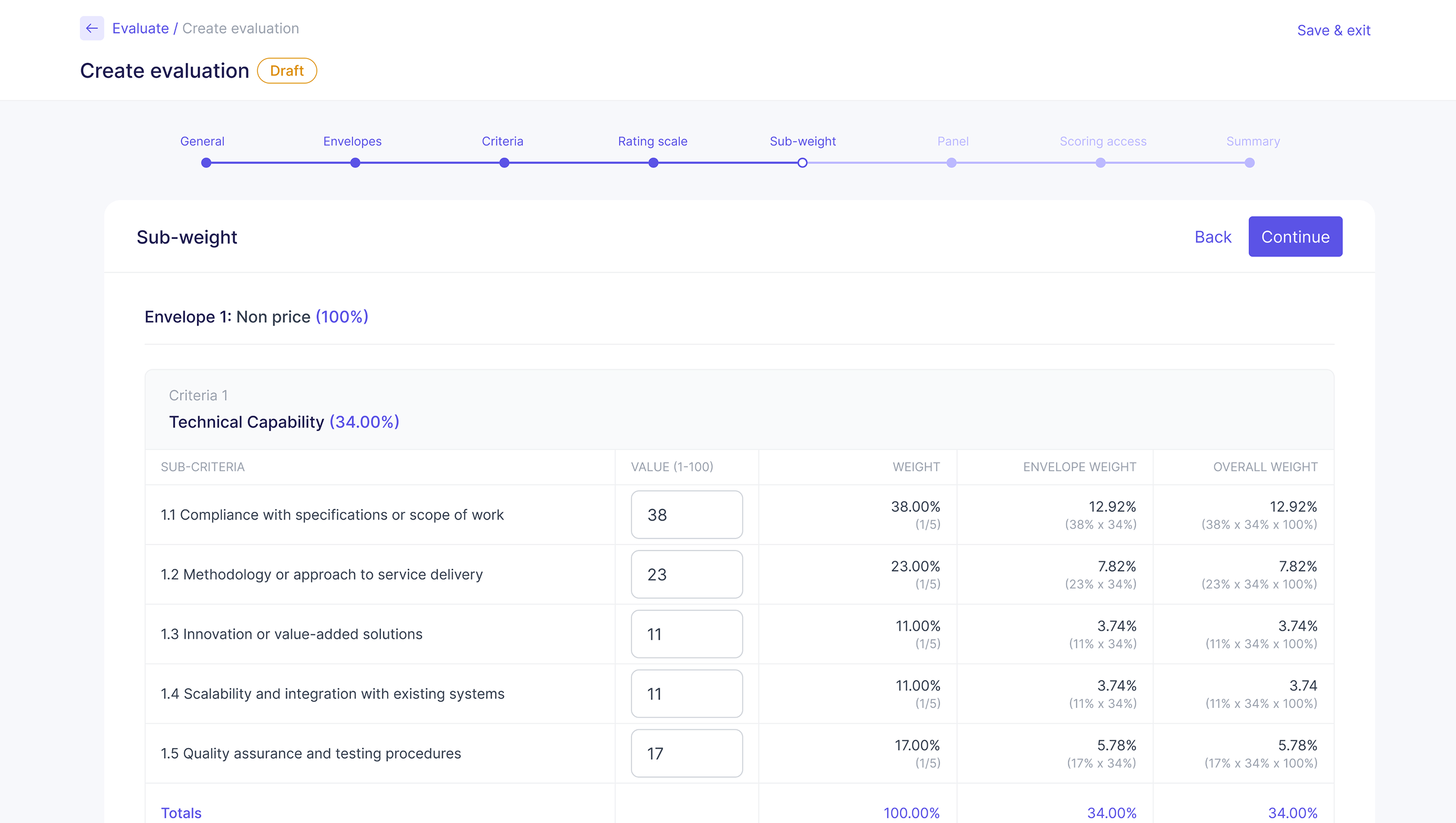 Set up evaluation frameworks with weighted criteria, scoring scales, and evaluation panels in minutes.